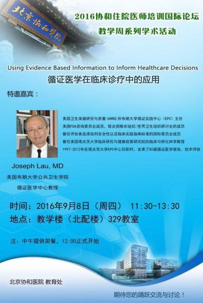 2016年9月8日和9日, UpToDate临床顾问邀请美国布朗大学公共卫生学院循证医学中心教授、美国卫生保健研究与质量所(AHRQ)布朗大学循证实践中心(EPC)主任Joseph Lau分别于北京协和医学院教学楼三楼多功能厅和四川大学华西校区新八教224教室进行了以“循证医学在临床诊疗中的应用”为题的学术讲座。特别值得一提的是,北京协和医院还把此次的讲座作为该院教学周的重要组成部分。