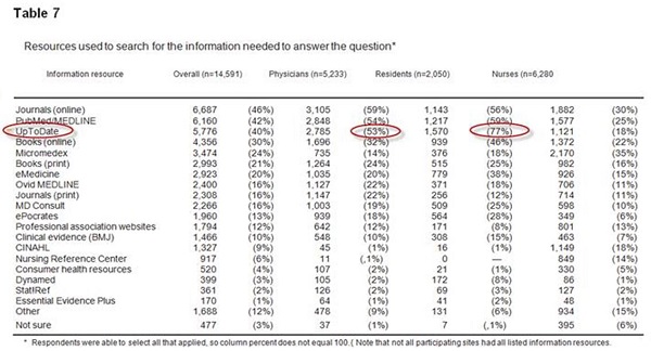Findings: A study of generalist physicians in Iowa investigated the obstacles preventing physicians from answering their patient care questions. Physicians asked 5.5 questions per half-day but pursued answers to just 55% of them. Of the 55% of questions pursued, UpToDate was used the most (41%) out of over 10 information resources consulted during the study. Other resources on the list included Epocrates (25%), MICROMEDEX (15%), and the Sanford Guide to Antimicrobial Therapy (14%).