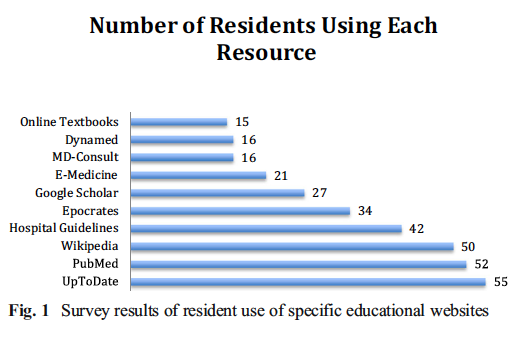 Findings: Of online sources, 98% of residents reported using UpToDate regularly, 44% used literature search, and 35% used Google.com or other search engines.