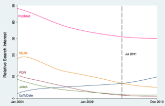 结论: 自2004年1月以来,与UpToDate有关的搜索量稳定增加,而其他在线医学信息的搜索量出现了降低(图1)。